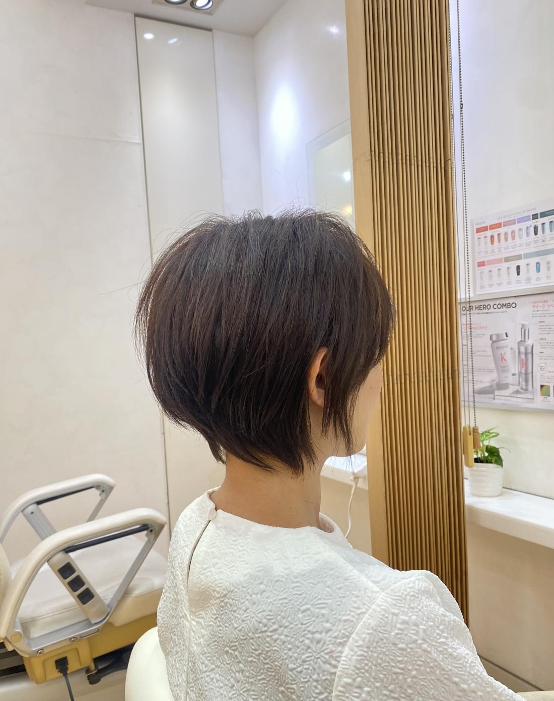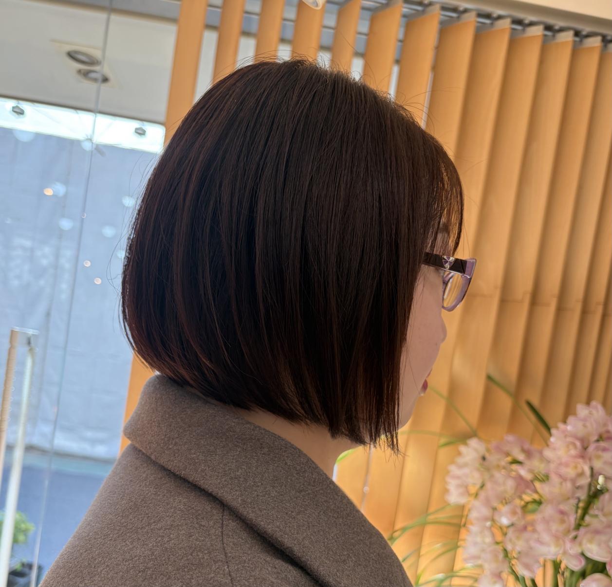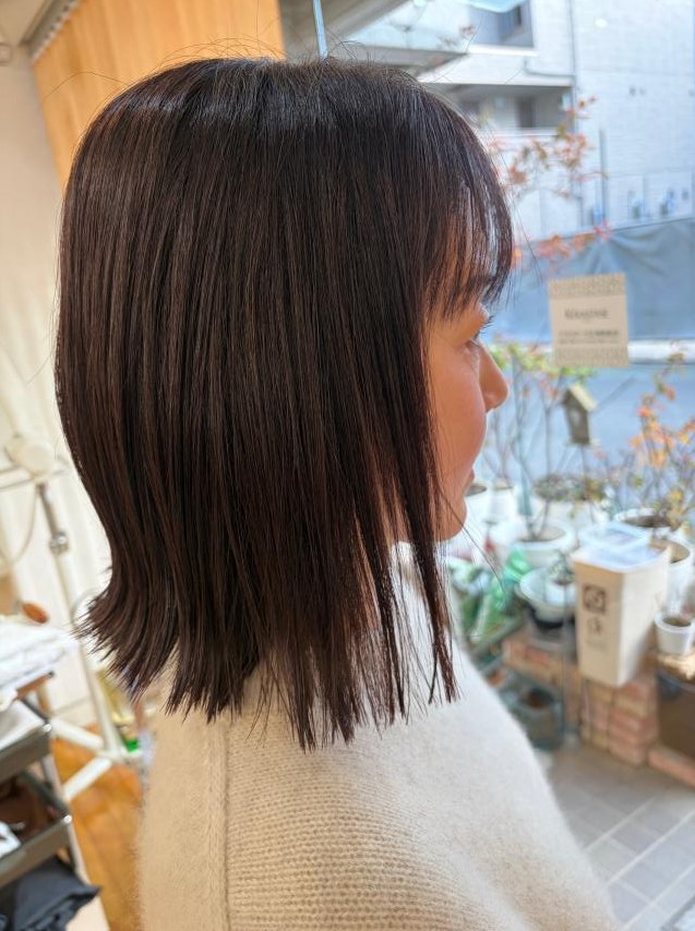 丸みのあるぱっつんボブ。四角のラインになりたくない方にオススメ。色持ちのいいウォームブラウンで染めました。おしゃれ染めですが、この色味なら白髪も
